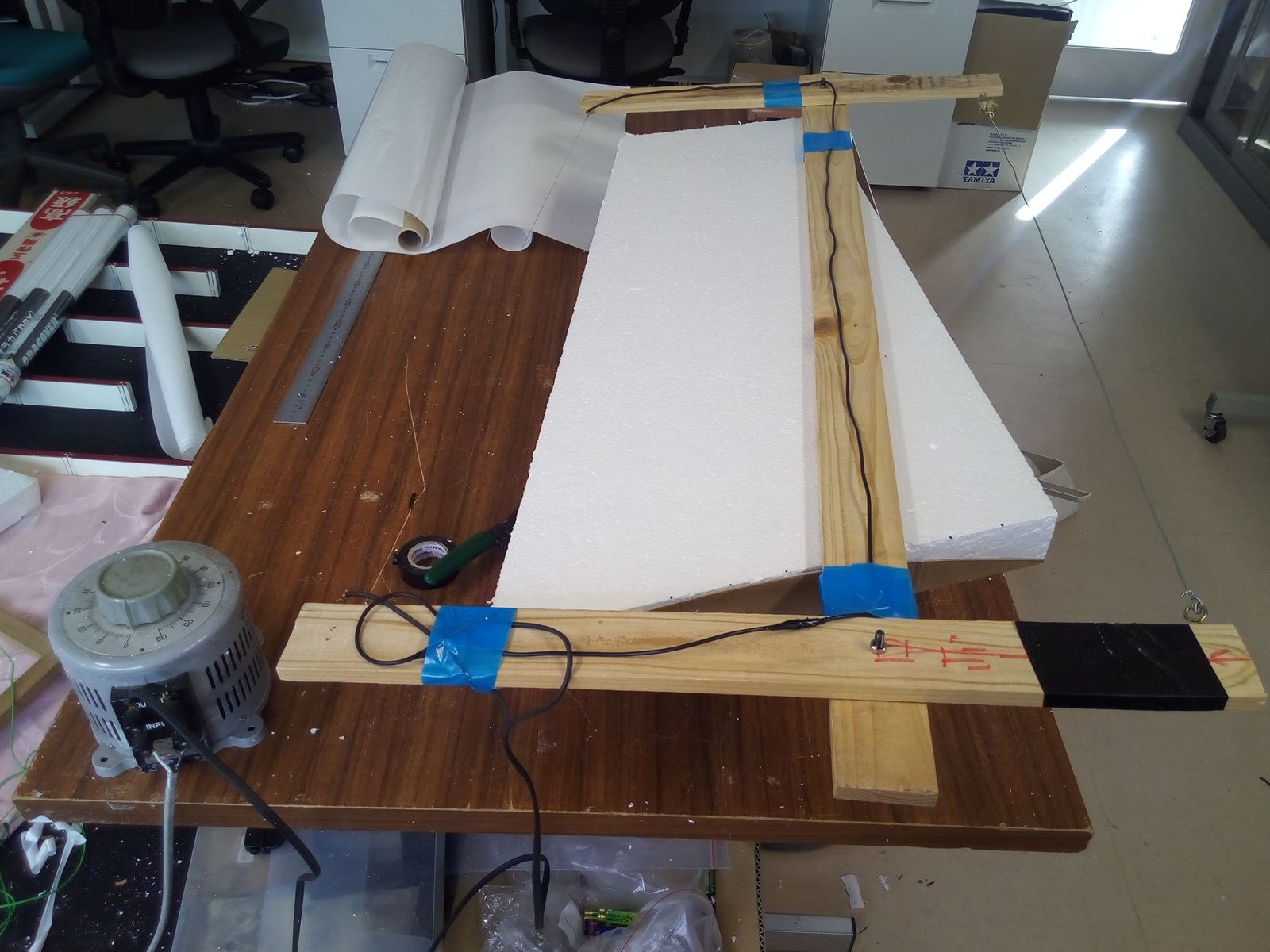 今度の主翼は大きいです.専用の発泡スチロールカッターを作りました.細いピアノ線をピンと張り,スライダックで電流を流します.1-2A?10V弱.ゆっくり進んでいく位に加熱します.熱すぎると発泡スチロールが熱で余計にへこんでしまいますので.発泡スチロールの両端に型紙を両面テープで貼り,カッターの重さで自然に型に沿うようにして,あとはゆっくり左右均等に引いていきます.左右を間違えないように同じことを繰り返し.送り速度にムラがあると翼の切り出しにもムラがでますが,切り込みすぎてないならサンディングすればきれいな曲面がでます.下の写真はサンディング前後合わせて記念写真.この状態で重さを測定,180g 大きさの割には軽いけど,最終的にどのくらいになるか?ちょっと大きすぎた感じはあります.まあその時は翼端をカットしますので,あえて翼端処理せずにカーボンファーバーでロービングしてバルサプランクしてフィルム貼ります.