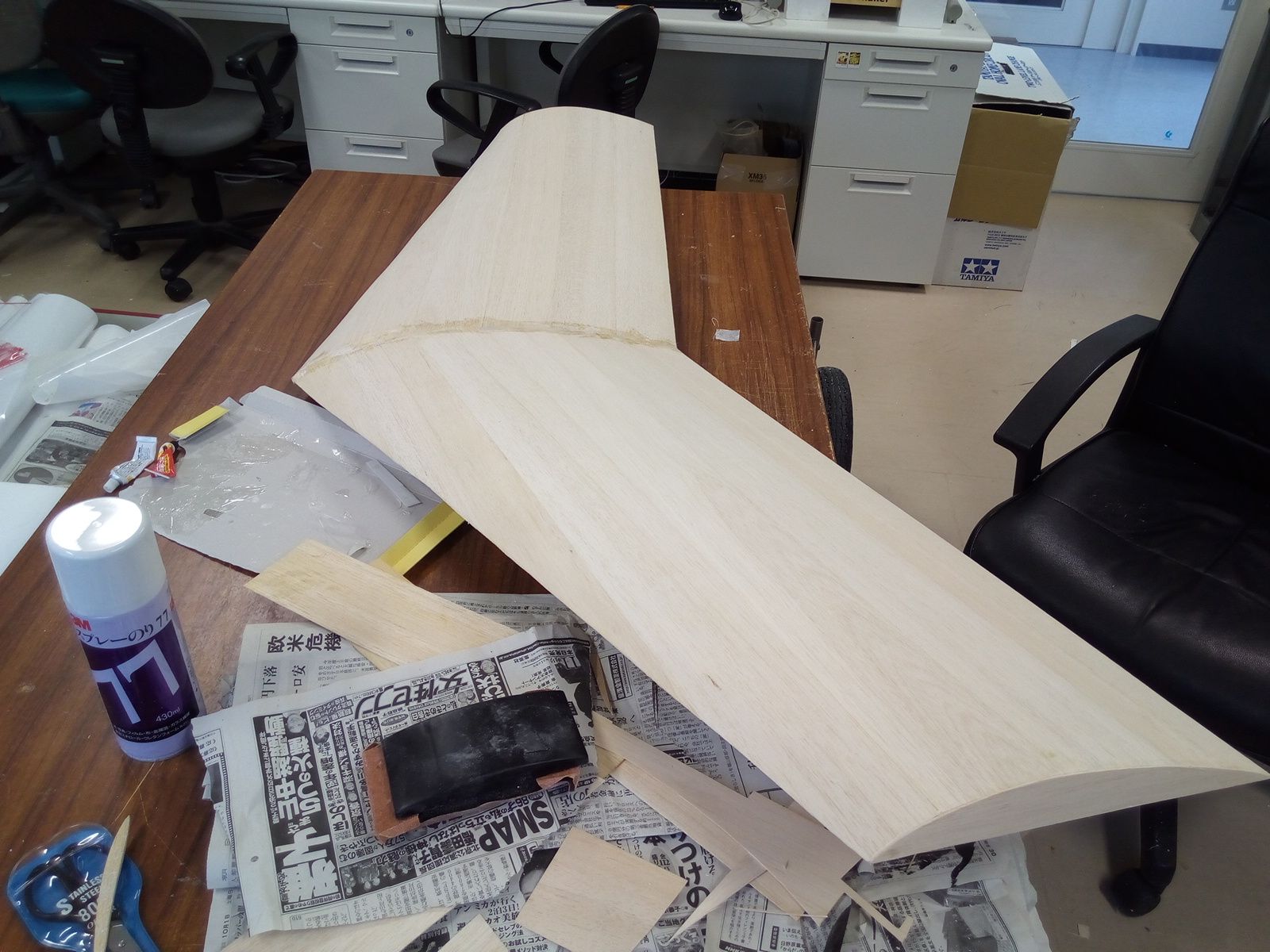 主翼をバルサプランク.まずフラットな裏面から.接着剤は3Mのスプレーのり77.次に表面の湾曲に沿ってバルサを貼り付け.湾曲の大きいところは養生テープで乾くまで補強.重量は,500g超えて一気に重くなってしまいました.使用したバルサの総重量が280g位あるので,100g位はサンディングしてもいいかな・・・