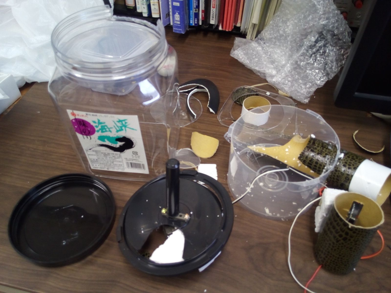 子供が卓球部だけどなかなか練習できないので,自宅のテーブルで練習できないと思ってトスマシンを作ってみた.本当はボールをびゅんびゅん出したいところだけど,モータや電源の調達や調整回路とかメンテナンスを考えると,壊れにくい負荷で動かすのが安全.できれば電池駆動で,という設計コンセプト.作り始めたところだけど,材料は以下の通り.CDケースの50枚くらいの,味ノリの容器,表彰状の筒,100円の模型用モータ,おもちゃのタイヤ,タミヤのギヤ,ほかだったな部材.まずはカナメの玉送り部分の作成,丸い円盤を切り抜いて,ピンポン玉のサイズの切り欠きを作り,モーターでゆっくり回します.100:1くらいで電圧2-3Vをかけると1秒1回転くらいします.発泡スチロールを固定と玉送りのために適当に現物を見ながら加工.CDケースに賞状の筒を横から差し込んで上面にボールの落ち込み,側面に先ほどの板を通す溝を切って円盤がピンポン玉の中心を筒に押し込むように調整.賞状の筒に切り込みをいれ,モータを固定.ラバーを接着剤でタイヤに張り付けてモーターに差し込み,ボールを回転で打ち出すようにしました.ボール送りと,打ち出しのパワーを調整.単一電池ボックスがあれば電池駆動で作りたかったけど,あいにく手元に無かったのでジャンクのACアダプターで3Vのものを見つけ,ダイオードを適当に入れて電圧をドロップさせてボール送りの速度と打ち出しの強度を調整.打ち出しがちょっと弱いですが,とりあえず完成.子供に使わせてみて打ち出しが弱いとなったら電圧ドロップ用のダイオードを外して強力に打ち出します.モータを高速に回すと振動が大きく寿命も心配,打ち出しの負荷もかかり,振動でボールの送りもたまに失敗しがちです.動画はこちら.卓球トスマシンの製作