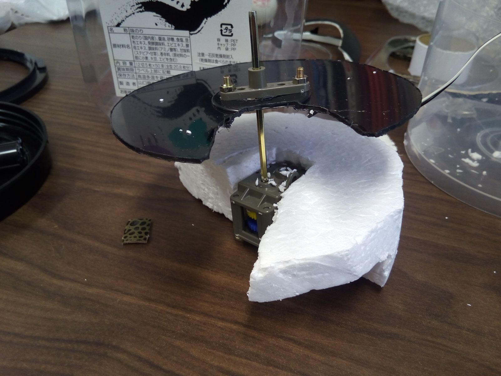 まずはカナメの玉送り部分の作成,丸い円盤を切り抜いて,ピンポン玉のサイズの切り欠きを作り,モーターでゆっくり回します.100:1くらいで電圧2-3Vをかけると1秒1回転くらいします.