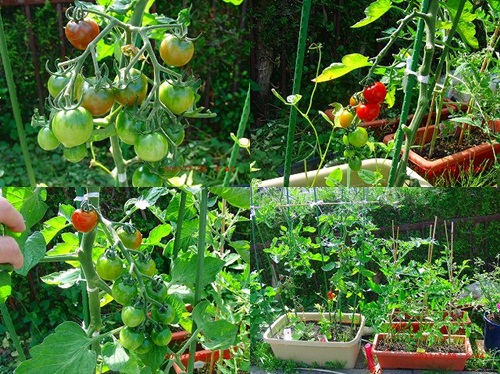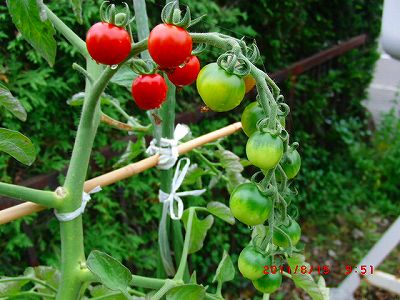 実は 8月の頭頃発覚したのですが、大事に育てたいた リコピーナ 赤と黒、5段目まで 実がついて房なり状態で2段目が丁度熟し始めていて、息子と食べるのを楽しみにしていたらなんと盗難にあいました。がっくり、かなり落ち込みました。お隣さんのトマトもやられていて、、、、かなりショック。しかも、盗難に気付いた次の日は 実の無くなった 茎まで ちぎり取られていて無残にも捨てられていました。もう 言葉も出ないくらいで。。。。でも、犯人が後日わかりました。アパートの下に住み始めた、ご家族の奥さんの妹のお嬢さん小学校5年生。。。。ちょっとKYなかぞくだと 思っていたんだけど、言葉もでません。一応状況説明はして 謝ってきたけど、トマトは帰ってこないし。。。もう、ショックです。今のところ被害のなかった3段目と4段目がかろうじて色づいてきたので画像アップップ。