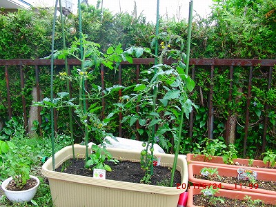 最高にいい感じできてます!もう3段目 開花 4段芽も花房が見えています!コンパニオンプランツでスイートバジルささげ エゴマを植えています。あと 空きスペースで虫よけ対策に 葉ネギ。とてもいい感じです。右横の 手前と真ん中のプランターは 去年の種実から 発芽した トマトの苗です。泣く泣く 間引いて 今 6個育成中です。実がつくといいんだけどな!植物って楽しいですよね!