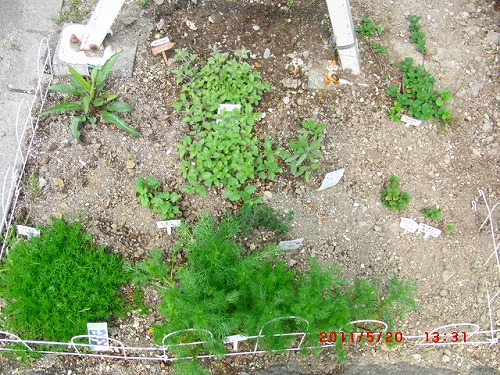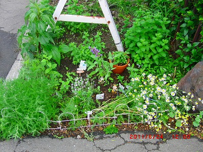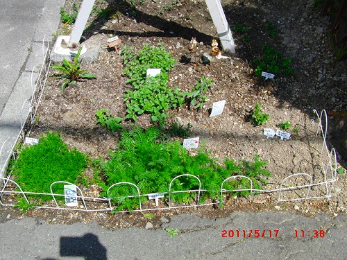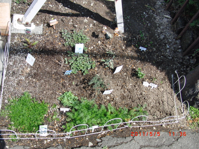 こんな感じなんとなく手前のジャーマンカモミールに 蕾がついてそう!まだ はっきりとは見えないけど、葉っぱの中に蕾がありそうな感じ。このミニハーブガーデン、去年は植えただけで終り。一度もどの子も お花を付けていません。今年は全部みたい!咲いておくれ~!!!