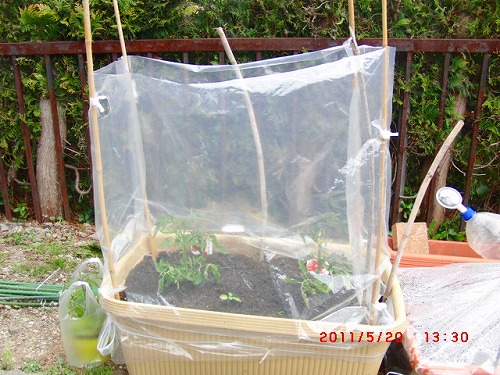 あまりに 気が焦りすぎて苗の状態で写真を撮り忘れました。。。。。4株を購入し 私が育てるのは 赤黒。オレンジはお隣さんへプレゼント。黄色は友達のお庭を借りて 私が育てる ちょっとかわった育て方です。一応 また 風よけビニールで囲い中。(かなり適当)左に黒・右が赤です。真ん中にちょっと 見えるフタバは あきぽんと 真冬に室内で蒔いたバジルが 発芽したものです。成長してくれたらいいな!