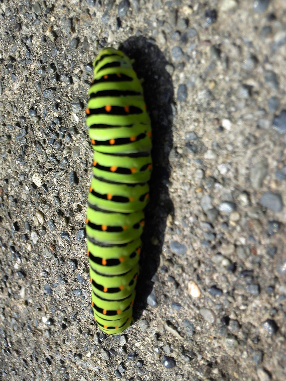 キアゲハの幼虫でした。 にんじんやパセリの葉がが好物みたい だから いたのね! かなりロックな配色に 絶対 綺麗な蝶々だと思って 図書館の図鑑で調べちゃった!何十年ぶりか?