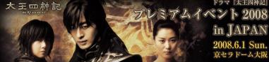 申込受付期間: ~ 2008/5/29(木) 11:00 ペ・ヨンジュン主演のドラマ「太王四神記」プロモーションの一環としてペ・ヨンジュンの来日が決定。これに伴い“ドラマ『太王四神記』プレミアムイベント2008 in Japan”が開催。☆ ドラマ「太王四神記」プレミアムイベント2008 in JAPANモアチャンス〔大阪〕申込受付期間: 2008/5/17(土) 11:00 ~ 2008/5/29(木) 11:00公演日 2008年6月1日(日) 開演 14:00 / 開場 昼12:00 全席指定-8,400円 会場 京セラドーム大阪(大阪) 一般発売2008/5/11(日) 10:00発売※モアチャンス(抽選販売)一般発売後に、追加席等があった場合に、プレリザーブと同じ方法で受付を行います。お申し込み多数の場合は抽選にて当選者を決定します。(先着順ではありません)。お席の位置は全て抽選で決定します。座席番号は当選時にご確認いただけます。ヨン様のことなら ☆ 太王四神記 DVD BOX I (第1話~第12話)ただいま発売中です。☆ 太王四神記 DVD BOX II (第13話~第24話)発売予定日は2008年6月4日です。ただいま予約受付中です。ぺ・ヨンジュン「冬のソナタ」以来5年ぶりとなるドラマ最新作!お待たせしました!2008年韓国ドラマの大本命!「太王四神記」本編DVD発売決定!4月から開始のNHK地上波放送ではカットされたシーンを含む、ノーカット版での発売! ヨン様のことなら ☆ 韓国・アジアドラマ&シネマスターガイドただいま発売中です。ペ・ヨンジュン主演ドラマ「太王四神記」の魅力、そして主人公タムドクの魅力に大接近! ストーリーや登場人物のほか、ドラマのトリビアなども紹介します。☆ 韓流検定3 ペ・ヨンジュン&チェ・ジウ特集 ただいま予約受付中です。 ヨン様のことなら ☆ Brokore magazine 15 (※表紙はコン・ユです)ただいま発売中です。 超大作ドラマ、ついに日本上陸『太王四神記』それでは、『太王四神記』の主役ペ・ヨンジュンのこれからの活動は?彼は今回のドラマに死力を尽くした。『冬のソナタ』のチュンサンのイメージにとどまることなく、確実に変身してみせた。彼にとって、『太王四神記』までの道のりは順調ではなかった。撮影途中、指の靭帯を切り、頚骨や肩の靭帯、膝の負傷など、満身創痍の状態で、その苦痛に耐えながら松葉杖に頼って最後まで撮影に臨んだ。最後のシーンを終えてから、キム・ジョンハク監督とペ・ヨンジュンが抱き合って嗚咽したのは、こうした苦難を乗り越え、三年間の長距離マラソンをやっと走りぬいたという喜び・・・(ブロコリマガジンNo.15 p71抜粋) 『太王四神記』の制作舞台、済州島ツアーペ・ヨンジュンが宿泊していたスイートルーム『太王四神記』制作陣のオフィシャルホテルとして指定されて以来、ロッテホテル済州はドラマファンの耳目が集まる場所となった。ペ・ヨンジュン、ムン・ソリ、イ・ジアをはじめ、豪華キャストの面々が長期滞在したため、撮影期間を前後してホテルに行けばペ・ヨンジュンに会えるかもしれないという期待があったからだ。ロッテホテル済州は、以前にも韓流ドラマの元祖ともいえる『オールイン』のオフィシャルホテルとして利用された。また、つい最近までペ・ヨンジュンは・・・(ブロコリマガジンNo.15 p59抜粋)ヨン様のことなら ☆ ぺ・ヨンジュン愛の群像の歩き方 上☆ ぺ・ヨンジュン愛の群像の歩き方 下ただいま発売中です。前作「愛の群像 ペ・ヨンジュンからの贈り物」で ドラマの魅力を徹底的に解析した著者が、今回は 各話別に更なる深い精神世界に踏み込みます。 ☆ 「太王四神記」公式写真集 ただいま発売中です。2008年、元旦、ペ・ヨンジュン初の超大型写真集発売! 未公開カットを多数収録した永久保存版!総制作費430億ウォンという韓国ドラマ史上最大規模の「太王四神記」。すでに本国では視聴率30%を突破し、今年一番の話題作となっています。本写真集では、ペ・ヨンジュンの登場シーンを中心にとっておきの未公開カットを多数収録しています。また歴史ファンタジードラマに因んだ豪華な装丁も写真集の魅力をより一層際立たせています。ヨン様のことなら☆ KOREANWAVE 25 ただいま発売中です。【表紙】ペ・ヨンジュン【巻頭大特集】ペ・ヨンジュン「太王四神記」日本放映記念号【トップスター4特製フォトギャラリー】イ・ビョンホン/ソ・ジソブ/チュ・ジフン/ペ・ヨンジュン ☆ Brokore magazine 14ただいま発売中です。brokore special 「太王四神記」ジュシンの星が輝く日、太王は眠りから目を覚ます! ☆ 愛してるっ!!韓国ドラマ18ただいま発売中です。喝采と共に韓国に戻ってきた!「ペ・ヨンジュン」本国が認めた彼の演技力!懇親の現地リポート「太王四神記」高視聴率の秘密を徹底解明ペ・ヨンジュン&キム・ジョンハク/ スターと巨匠の出会い、その成果/放送に先立ち、これだけは覚えておきたい主要キャスト完全紹介/複雑な人間関係も一目で分かる登場人物相関図現地記者がドラマの見所を緊急報告/ 必見!4つのポイント/第1話から第7話までの物語を先取り!/ 序盤のストーリーガイド韓国主要メディアが伝える”テサギ”/