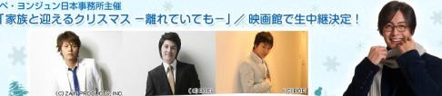 「家族と迎えるクリスマス-離れていても-」にペ・ヨンジュンの衛星生中継出演&全国劇場生中継決定! 約2年ぶりに来日したペ・ヨンジュンの2週間にわたる日本滞在に密着した未公開オリジナル映像とRyuさん、カン・ヨファンさん、ウ・ソンミンさんなど豪華ゲストによるミニコンサートで素敵な歌声とともに迎える2008年のクリスマスイベントに、ペ・ヨンジュンが韓国から生中継で参加することが決定しました。(2008.10.31 公式サイトより)★ ペ・ヨンジュン日本事務所主催 「家族と迎えるクリスマス -離れていても-」劇場生中継(札幌シネマフロンティア)公演日 2008年12月14日(日) 開演 17:00 / 開場 16:30 会場 札幌シネマフロンティア シアター3(北海道) 一般発売2008/12/6(土) 10:00発売 全席指定-3,800円 【注意事項】 同日横浜アリーナで開催される「BOFi主催 家族と迎えるクリスマス -離れていても-」をモニタービジョンにて鑑賞。ペ・ヨンジュンさんの本イベントに伴う来日の予定はなし。★ BOFi主催 「家族と迎えるクリスマス -離れていても-」/パブリックビューイング〔全国〕一般発売中全席指定-3,800円 【注意事項】 ※ペ・ヨンジュンさんの本イベントに伴う来日の予定はございません。 2008/12/14(日)17:00 新宿バルト9 (東京都) 2008/12/14(日)17:00 T・ジョイ大泉 (東京都) 2008/12/14(日)17:00 T・ジョイ新潟万代 (新潟県) 2008/12/14(日)17:00 梅田ブルク7 (大阪府) 2008/12/14(日)17:00 広島バルト11 (広島県) 2008/12/14(日)17:00 T・ジョイ出雲 (島根県) 2008/12/14(日)17:00 T・ジョイ リバーウォーク北九州 (福岡県) 2008/12/14(日)17:00 T・ジョイ パークプレイス大分 (大分県) 2008/12/14(日)17:00 T・ジョイ久留米 (福岡県) 2008/12/14(日)17:00 鹿児島ミッテ10 (鹿児島県) BOFi主催 『家族と迎えるクリスマス - 離れていても -』開催決定今年6月、約2年ぶりに来日したペ・ヨンジュンの2週間にわたる日本滞在に密着した未公開オリジナル映像を大公開!また当日は、華を添える豪華ゲストとして、ドラマ「冬のソナタ」のRyuさん、ドラマ「ホテリアー」のカン・ヨファンさん、映画『四月の雪』のウ・ソンミンさん、が続々と出演決定!素敵な歌声とともに迎える2008年のクリスマスをどうぞお楽しみに!※ ペ・ヨンジュンさんの本イベントに伴う来日の予定はございません★ 家族と迎えるクリスマス -離れていても-公演日 2008年12月14日(日) 開演 17:00 / 開場 15:30 会場 横浜アリーナ(神奈川) 出演者など [出演]Ryu(シンガー) / ウ・ソンミン / カン・ヨファン 一般発売2008/10/18(土) 10:00発売 全席指定-6,300円 ヨン様のことなら ☆ 冬のソナタ プレミアムBOX カットシーン完全収録【ミニョン眼鏡付き】発売予定日は2009年1月21日です。 ただいま予約受付中です。韓流ドラマの金字塔『冬のソナタ』 幻のカットシーンを完全収録し初DVD化!!さらに未公開映像を含むメイキング・インタビュー・NG・TV番組等お宝映像満載! ミニョン・モデルの眼鏡&オリジナル・ブックレットを収納した豪華BOX仕様!3万セット限定生産発売!! ※ドラマ本編はダイジェスト収録となります。本編:ドラマダイジェスト(約455分)(※約200分に及ぶカットシーン完全収録)特典映像:日本未公開映像を含む豪華映像特典(約130分) オリジナルBOX、デジパック仕様封入特典:KBS公認 冬のソナタ眼鏡(ミニョン・モデル)/オリジナル・ブックレット ヨン様のことなら全20話を1BOXに収録した“冬ソナ"ファン注目のDVD-BOX!韓流ドラマの金字塔「冬のソナタ」がお求めやすい価格になって登場!パッケージも新たに、よりおしゃれにコンパクトになりました!☆ 冬のソナタ スタンダードBOX発売予定日は2008年11月21日です。 ただいま予約受付中です。母と妹と3人で暮らすチョン・ユジンは明るい女子高校生。幼なじみのキム・サンヒョクとは家族ぐるみの付き合いで、まるで兄妹のよう。そんなある日、ユジンはソウルからの転校生カン・ジュンサン(チュンサン*)と恋に落ちた。しかし、突然の悲劇が2人の初恋に終止符を打つ。10年後、建築デザイナーとして活躍するユジンの前に、チュンサンとそっくりのイ・ミニョンが現れて・・・。突然の悲劇に引き裂かれた初恋のゆくえを描く、熱狂的な人気を呼んだ純愛韓流ドラマ。※本商品には、以前発売されていたDVDに収録されている特典映像は収録されておりません。 ※本商品は、2003年当時のNHKでの放送用に各回約59分に編集されたものを収録しています。 【出演】 ペ・ヨンジュン/声:萩原聖人、チェ・ジウ/声:田中美里、パク・ヨンハ/声:猪野学、パク・ソルミ/声:林真里花、イ・ヘウン/声:片岡身江、リュ・スンス/声:小森創介、他 【演出】 ユン・ソクホ 【枚数】 7枚組 【収録時間】 1184分 【話数】 全20話 【字幕】 日本語 【音声】 韓国語、日本語 ヨン様のことなら ☆ ペ・ヨンジュン 2009年カレンダー☆ 卓上ペ・ヨンジュン 2009年カレンダー☆ 太王四神記 2009年カレンダーただいま発売中です。ヨン様のことなら ☆ 太王四神記 PREMIUM EVEVT 2008 IN JAPAN -SPECIAL LIMITED EDITION- 初回限定生産版 発売予定日は2008年11月28日です