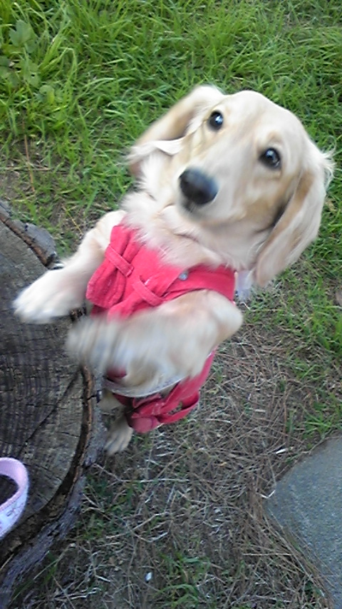 お勧めは休憩中にジャーキーをあげようとしたら、ちょうどあった切り株の上に手を置いて、ちようだい、ちょうだいのポーズをしてるやつ!