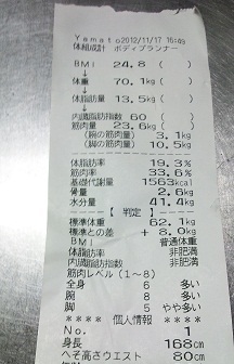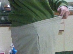 咳も粗方治ったが、ダイエット最中に買ったズボンも、ブカブカとなり、新たにズボンを購入した今日この頃・・・ 改めて、太っていた当時のズボンを吐いてみると、雑誌の裏表紙とかにあるダイエット商品のような状態になった。○下にズボン履いてても余裕で入る有様。-------------------- 前回のブログでさらっと言ってしまったが、去年の8月位から始めたダイエット計画(自分改善フェイズ1)が、先日遂に目標の65kgを達成する。 自分の中では病気と思っている程、口に何か入れてしまうと足らない他に何かないかと探してしまうので、騙されたと思って購入した飲み物タイプだったプロテインダイエットも、気付けば大当たりだったようである。 毎日、夕方、寝ている時になると腹減ったと訴えていた事と、帰りもラーメン屋などの魅惑の香りにそそのかされそうになった事もしばしばあったが、それもこの時の為と思えば、いい思い出である。 取り敢えず、今までのやってきた事を、リバウンドしてしまった時に、まとめておこう。「→」に関しては自分で決めた妥協点ーーーーーーーーーー(1)一番飯の量が多い晩飯をプロテインダイエットに置き換える。→朝、昼、土日祝はリミット開放(普通飯)とする。(2)なるべく毎日1万歩を目指す為、帰りを2駅分歩く。帰りが21時を超えない程度の普通の帰宅時には2駅分を歩く。どこか行くタイミングは万歩計(スマホ内蔵)ON。→帰りが21時以降になってしまう遅い日は、電車帰宅。(3)ただ痩せるだけだとガリガリになるんで帰ったら(腕立て、腹筋、スクワット×10回)の2セット→土日もやるが、スノボとか温泉とか体が疲労感がある時は省略。(4)休みになれば、なるべく新陳代謝を活発にしようと、温泉に行ってサウナ等を利用する。駄目な場合は、自宅のお風呂を沸かし、入って上がってを繰り返し、なるべく汗をかく。→平日は、毎日、風呂を洗ったりするのが面倒いので、シャワー。(5)腹が減ったら、珈琲とかで腹減りを紛らわす(これは、体調的にはお勧めしない)ーーーーーーーーーー ・・・こんな感じを繰り返していた事だろう。そんなこんなで、これを自分的に長続させた方法としては、以下の3つであろうか。ーーーーーーーーーー(1) ほぼ毎日(飲み会や、実家帰省で出来なかった場合は除く)のように、体重計で体重を計測して、目標を見失わないようにしていた事と、それをカレンダーに残しておいた事(下記参照)(2) 一度、妥協したら、負け!(これは負けず嫌いの自分ならではの発想だったかと)(3) 妥協したい日もあったが、その時は、逆にダイエットをしなくていい理由があるかを自分に厳しく問いて、理由がない事を悟らせて、渋々と続ける。 例1) 普通飯を食いたいと思った時 リミット解除の休みの日から1~2日しか経過してないじゃないの? 朝、昼飯食ったんじゃないの? 栄養が必要な位、風邪などの体力が落ちてたっけ? 先週から1kgでも体重減ってる? 例2) 腕立てとかが面倒い時 今日は、運動なんかした? 筋肉痛じゃないんだよね? 体を動かしたら吐いてしまうような、泥酔しているんじゃないよね? 日課の5分程度の時間がない程、何か忙しいの? 取りあえずは、渋々でもやった事には変わりない事も、長続きをさせた事なんじゃないかと・・・ はてさて、取りあえずは目標達成した為、2~3日起きで普通飯を食うようにしたが、食生活は改善していないので、食べる量は太っている時と変わらず・・・何とかこっちも改善したいが、しばらくは無理と判断しているが、維持はしないといけないのでプロテインダイエットは、数日起きでも継続はする事にはしている。また、腕立ては今も毎日継続中。本当に維持って大変! さて、フェイズ1は完了したが、新たにフェイズ2と3を計画中。内容については、秘密・・・。○以下、カレンダーに書いていた今までの体重の記録。上が歩数。下が体重。実家帰省や書けなかった日は未記載。ちなみに、3月の中で65kgになってから、プロテインダイエットを2~3日起きとしていた為、その後、しばらく66kgとなっているが、今日は65kg!