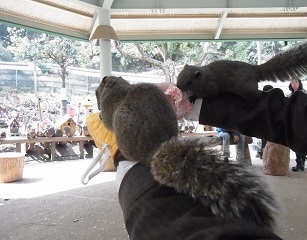 風邪をひいてしまい、熱もあったが会社を休めず、何とか1週間。熱もひいたものの、咳が酷くて、1日起きに寝れない日々が続く今日このごろ・・・(今朝は、ほぼ寝れなかったので、晩は安眠確定。ってよくないんだけど・・・)-------------------- 3/10 町田リス園に向かう。知人や、HPなどで見ると、直接、リス(タイワンリス)に餌をあげる事が出来るようで、リスの大群に囲まれるようだ。朝か、閉館前が一番凄いらしい。フェレット、猫、犬、アルパカと動物に癒されている自分にとっては、今回はリスに囲まれてみたいと楽しみで向かった。 勿論、一番凄い開園30分以内にリス園到着。入ってみるなり、リス、モルモットなど動物だらけ!自分にとっては、何とも癒しの空間である。早速、リスに餌がやれるスペースに入る。 もうのっけから、リスだらけ!色々な方が餌をやっているが、人の周りはリスだらけ・・・期待していた光景だけに、早速、こちらも餌(ひまわりの種)を購入する。園内の方が、手袋を着用してとの事であったが、チュー太や、ダベ(猫)など動物には噛まれまくった自分にとってみては、この程度で手袋?と思いつつも、左手に手袋、右手に餌を持つ。 早速、餌をあげてみる。 来るわ来るわ。リスが来る。肩だの膝だの、色々な所に群がってきた。・・・と思っていると、リスが目指すは、手袋無しの餌を持つ右手狙い。ちょっと待て!右手は無防備!餌の入った袋を爪を立てて、必死に取りに来る。 餌を撒いたり、一匹ずつ餌をやったりするも、その間、他のリスは、やっぱ右手狙い。思っていた以上に、このリス共は、抜かりなし。 最終的には、自分が負けを認め、リスに対し「ごめんごめん」と連呼状態となってしまった。 餌がなくなったものの、まだまだ、こやつらは、必死に袋に頭を突っ込んでも餌を探す。思っていた以上に、凄い光景であった。動物だからと舐めてかかっていたのが、間違いだったようだ。 気持ちを改め、再度餌を購入し、今度は意地悪く、餌を頭の上にちらつかせながら、やってみる。背を伸ばして、手を合わせながら「ちょうだい!ちょうだい!」とする光景は何とも愛らしいものであった。 それでも、背を伸ばして、自分の手を必死に掴む際は、こちらも、それ相当の爪による傷が増えていくばかりであった。 まぁ、手は傷だらけになったものの、結果的には、自分は満足!リスは飼った事ないだけに、これだけ触れ合えれた事で、思った以上に楽しめた。 満足した所で、その他の動物も見ていく。プレリードッグがいるが、何だだろ?この丸々とした、動物は!アンヨ(足)が、ピョンとしてくつろいでいる姿は何とも愛らしいものであった。しかし、壁を見ると、今はダイエット中な上に、気性が粗いらしい。この壁紙をみれば、否応がなくても、見た目とは裏腹に、危ない事が理解出来た。 次にモルモット!以前のアルパカと同じく。こちらも、毛が短かかったり、縮れ毛だったりで、いろんな種類のモルモットがいるようだ。やっぱり、こやつらにも、頭の上に餌をちらつかせると、いろんなモルモットが「ちょうだいちょうだい」と背を伸ばす。う~ん。なんとも言えない。 実家の猫、もっと前にはチュー太と動物と触れ合ったのが、ご無沙汰だっただけに、この日は、色んな動物と触れ合えて、大変癒された一日であった。 それにしても、この日はニュースでも出ていたが、乾燥して煙霧と呼ばれる数m先が見えない状況となっていたが、家に帰ってくると、喉がガラガラとなってしまった。ここからが、風邪との格闘になるとは、この時は知らない・・・●リスとの格闘結果---------------------------------- ※8ヶ月経過。現在65kg(20kg)---------------------------------- あっさりと言うべきではないものの、半年近くで目標の65kg達成!半年とは言え、目標に到達に自分自身で頑張った事には感動したものの、さて、何も考えなかったが、この先は、どうしよう?食事改善もしてなかったし・・・・。と思いつつ、結局、「プロテインダイエット」を更に2箱買ってしまった。 取りあえずは、普通に食べるは食べるが、維持の為、不定期ながら、ダイエット食は継続しようかと・・・