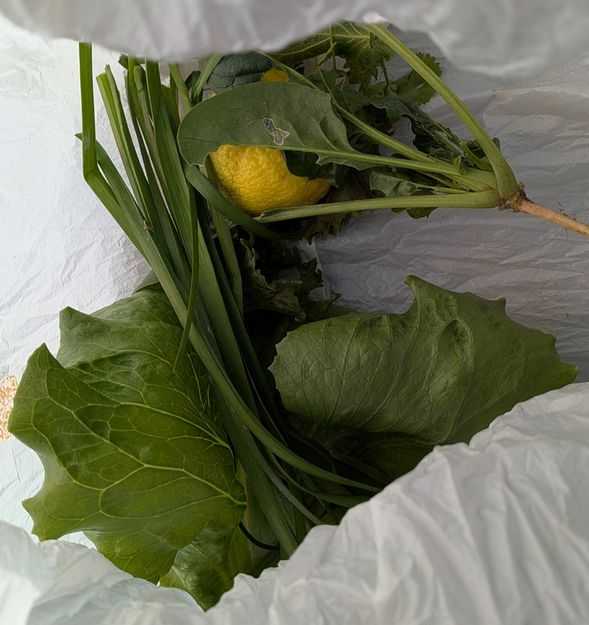 今日の収穫物:柚子、四季香菜、法蓮草、レタス、ニラ