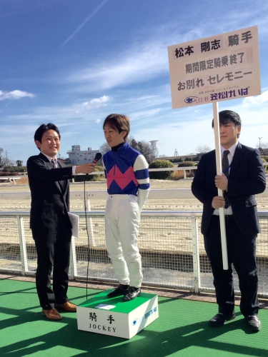 ★まず11日の『松本剛志騎手 期間限定騎乗終了セレモニー』より。当日の様子は、写真を提供してくれた黒ゆりさんのブログをご覧ください。愛馬会の後藤夫人、門松を解体の巻。★3日間開催だったJRAのおさらい。土曜京都8レースの穴狙いは、見せ場まで。続く中山9レースが、◎→▲→△で万馬券に。自分は馬連中心でしたので、ゴール寸前で2着が入れ替わらなかったらもっと良かったのですが・・・『フェアリーステークス』は9番人気「レーヴドカナロア」から高配当を狙いましたが、伸びはなく終了。日曜の中山9レースの1点買いは失敗。中山10レースの四頭のボックス馬券買いは、押さえのワイドのみで取りガミに。『日経新春杯』は「 アフリカンゴールド」を狙いましたが、行きたがって消耗した感じで15着に完敗。劣勢ムードでしたが、京都12レースの狙い馬リストの「エネルムサシ」が3着は死守。ここは人気の1枠の二頭は内枠が微妙で、3連複のヒモ穴狙いがハマって、211倍の高配当を的中。逆転プラスに。そして月曜。まず変わり身を期待した「ワカミヤオウジ」(中山9R)は不発。『京成杯』は◎「ランフォザローゼス」が2着には来てくれましたが、「シークレットラン」との二頭軸の馬券だったので撃沈。『淀短距離ステークス』は「フミノムーン」の大駆けに期待しましたが、まだ良化途上でしたかねぇ。そして最後の推奨馬「ピースユニヴァース」(中山12R)は、ポツンと最後方から大外を鋭く伸びて2着。ここは相手を三頭に絞って、勝ち馬がヌケ。3着馬とのワイドしか取れず。下の写真は、目的の?菜七子ジョッキーとの写メ会はならずも、武藤雅ジョッキーとの口取りは実現した木村オーナー。★火曜から名古屋けいば『新春ペガサスカップシリーズ』が開幕します。注目の重賞『新春ペガサスカップ』は水曜に行われます。e-SHINBUN(イー新聞)のサイトやローソンやファミマのマルチコピー機での予想の販売を開始しております。また1レース単位でも購入いただけるnetkeibaでも予想をしております。名古屋・笠松全レースと園田のラスト3レースを配信中です。※それに伴い、従来の「大黒社ネット予想」は、この1月31日で終了します。予想はレース前日の夜10時30分頃にアップする予定ですが、コ ンビニのマルチコピー機での予想の配信は、それより遅れる場合があります。よろしくお願いいたします。