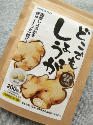 手足の冷えが気になる憂鬱な季節がやってきますね…冷え取り靴下も愛用中ですが、身体の中から温めるようにしたいので、温め食材の代表選手“生姜”のタブレットをお試ししてみました★三笠産業株式会社さんの『どこでもしょうが』です♪便利野菜でも大好評の「しょうがパウダー」を更に取り入れやすい、タブレット状の粒にしたものです。便利野菜さんは、野菜パウダー・乾燥野菜をたくさん扱っています♪元々は野菜パウダーを作る技術として活用されていた超微粉砕技術を更に極め、野菜を丸ごと超微粉末にした「ファインパウダー」を製品化して、タブレットにしています。袋を開けるとしょうがの香りが広がります!それもそのはず。1粒250mg中、生姜粉末240mg。つまり、生姜の粉末をぎゅっと握って固めたようなものってことですよね♪鹿児島産しょうがを使用しているそうなので、安心の国産原料(*^^)v1日3~9粒を目安に、水やぬるま湯などの飲み物と一緒にお召し上がりください、とのことなので…朝3粒、寝る前に2粒を飲んでいます。タブレットを口に入れて、水を飲むまでのわずかな時間に、口の中で生姜が少しずつ溶け出すのがわかります!辛い、辛い~~(笑)急いで水で飲みこみます(笑)3粒だとたま~に飲みこみにくいこともありますが、2粒だとのどにひっかかる感じはしません。…が、口の中の辛みがなかなかひかず、ちょっと多めに水を飲み続けることになります(笑)肝心の温め効果は…まず飲んだ直後は、胃のあたりがポカポカ!これは生姜の刺激で胃がポカポカしているように感じるだけでもしれませんが…それ以外は、明確&劇的に感じる効果はないものの、指先・足先の冷えを感じることが少なくなったような気がします。飲む量が少ないのかな~?1日9粒まではOKなので、季節に合わせて飲む量を調整できるのもいいですね。夏は少な目に、冬はたくさん飲んで、冷え対策に役立てられそうです♪便利野菜ファンサイトファンサイト参加中三笠産業株式会社 ★ランキング参加中★ あしあと代わりにポチッとお願いします♪レシピブログに参加中♪ にほんブログ村 にほんブログ村 ★いつもブログの応援ありがとうございます★