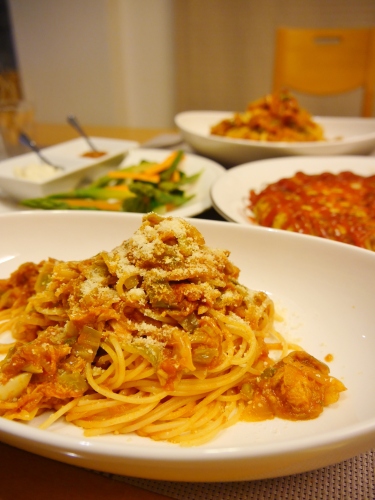 10月25日は世界パスタデー …だそうです。知っていましたか?1995年の10月25にイタリアのローマで「第1回世界パスタ会議」が開催されたことを記念して、1998年に制定された記念日。この日、世界各国ではパスタの魅力を伝えるさまざまなイベントが開かれるとか★◆世界パスタデー http://www.worldpastaday.jp/我が家が夕食にパスタを食べるのは、世界パスタデーにちなんでいるわけではなく、給料日前の節約料理なんですけどね(笑)冷蔵庫にあったキャベツの残りとツナ缶で作ったトマトソースのピリ辛パスタ。あとは、ベーコン・玉ねぎ・ジャガイモ入りのスペイン風オムレツ、野菜スティック。とりあえずお腹いっぱい、ワインもススみました(笑)ツナとキャベツのピリ辛トマトパスタ料理名:ツナとキャベツのピリ辛トマトパスタ作者:yunachi■材料(2~3人分)パスタ / 200~300g塩(パスタの茹で塩) / 大さじ2~3玉ねぎ / 1/2個キャベツ / 3~4枚ツナ缶 / 2缶鷹の爪(半分にして種を取る) / 1本にんにく(みじん切り) / 1片デルモンテ 基本のトマトソース / 1袋白ワイン / 大さじ2塩・胡椒 / 少々■作り方1.玉ねぎは薄切りに、キャベツは、幅1cm×長さ2cm程度の短冊切りにする。パスタ用のお湯を沸かし始める。2.フライパンに、ツナ缶の油ごとツナを入れ、鷹の爪、にんにくを入れて中火で炒める。3.にんにくの香りがしてきたら、玉ねぎ・キャベツも加えてさらに炒める。※パスタ用のお湯が沸いたら塩を入れ、パスタを茹でる4.玉ねぎ・キャベツがしんなりとしたら、基本のトマトソース、白ワインを加えて、弱火で5分ほど煮込む。5.5分ほど煮たら、塩・胡椒で味を調える。6.茹であがったパスタを入れて、トマトソースを和えて、器に盛り付ければ完成♪■レシピを考えた人のコメントツナ缶の油も使うので、ツナの旨みを残さず使い切るコクウマレシピ。キャベツと玉ねぎもプラスして野菜もたくさん食べられます♪詳細を楽天レシピで見る━━━━━━━━━━━━━━━━━━…↓↓ ポイントが貯まるレシピ サイト ↓↓>>最短約 30 秒!▼無料▼会員登録<<━━━━━━━━━━━━━━━━━━…冷蔵庫に残っていたトマトソースがこちら。デルモンテの基本の完熟トマトソースです♪トマトの水煮缶を使うよりも、トマトソースを使う方が短時間でもコクのある味にまとまるのでオススメです♪【5,000円以上8%offクーポン配布中】デルモンテ 基本の完熟トマトソース / デルモンテ★税抜1900円以上で送料無料★デルモンテ 基本の完熟トマトソース(295g)【デルモンテ】缶よりも、紙パックよりも、パッケージの後始末がラクなパウチタイプなのがいいですね♪我が家の給料日は、ちょうど世界パスタデー。お給料日はちょっと奮発したパスタを食べてみるのもいいかな~(^m^)お取り寄せするなら、ピエトロの通販サイトで販売されているパスタソースは湯煎するだけで本格的なお店の味が楽しめるものが多くて、迷って選びきれません!《公式》ピエトロ通販サイト以前に食べた季節限定の『真っ赤な3種のトマトソース』も美味しかったな~★自分でトマトソースを作るときに、トマトを3種類も準備することなんてないから贅沢ですよね~(^o^)bいろいろなアレンジが楽しめそうなトマトソースでしたが、鶏ハムをトッピングして食べたパスタはボリューム満点でした!素材にこだわったスペシャルなパスタソース、お給料が出たらいろいろお取り寄せしてみたいな~★【ピエトロ】☆世界パスタデ―☆ あなたの“ご自慢パスタ”を教えてください♪ ←参加中 ★ランキング参加中★ あしあと代わりにポチッとお願いします♪レシピブログに参加中♪ にほんブログ村 にほんブログ村 ★いつもブログの応援ありがとうございます★
