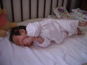 昨日の朝のこと。ミュウはいつもどおり、足をバタバタと、機嫌よく暴れまわっていた。そのうち、今まで足があがるくらいだったのが。体が横向きになってる!!!さらに、足が横に伸びてる!!!もう寝返りしそうな勢い・・・。で、この状態で苦しくなったみたいで、泣いていた。。。首もまだ据わってないんだから、寝返りしないでちょうだい~!!でもって今日も、この体勢がお気に入り♪今日はこの体勢のまま、ちょっぴりまどろんでいて。。。うつぶせ寝じゃなくて、横向き寝!?もうベビーベッドの柵をしなくちゃダメだな~。