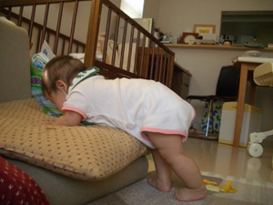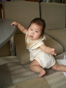 もうね、ミュウのことで何があっても驚きません。。。だってね、そんな感じ、前からしてたもの。何となくね、動いてるなぁ。って気付いてたもの。気付きたくなかっただけで。。。でもね、認めてあげるわよ。はい。昨日、ミュウがつたい歩きをしました。。。って言っても、50cmくらいだけど。間違いなく動いてました。。。でもって、今日も様子をみていると。机にそって、やっぱり歩いてました。机の周りから、座椅子の段差を上手に登り、座椅子の背もたれをつたい・・・今日は直線にしたら1mくらいは動いてたんじゃ・・・でもね、歩くよりもハイハイをしていた方が足が鍛えられる。らしいよ。?ハイハイを上手にしてよ。視界が高いのが楽しいのかなぁ。。。
