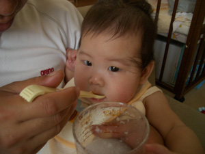 3ヶ月の頃から、ゆうな達がごはんを食べると、ジ~ッとみるミュウ。4ヶ月になる頃には、ヨダレがすごくて・・・今は、あっという間にスタイがビチョビチョになるくらい。。。で、今日、とおちゃんのお仕事が休みだったので、はじめてみました♪朝からご飯を炊くゆうな。・・・昨日の夜、炊いておくの忘れてた・・・炊き上がるまでに、ミュウの機嫌が悪くなり・・・まぁ、寝てもいいか~。と思い、おっぱいをあげました。が、意外にも眠らず、おっぱいを飲んだ後はご機嫌で遊んでる。それから20分くらいで炊き上がり、裏ごしをして準備!その様子を見ていたとおちゃん。「これ、毎日するんか~。大変そうやな・・・」・・・離乳食を始めたがってたのは、とおちゃんじゃないか~!!!出来上がった10倍かゆをミュウにあげてみると・・・ぱくっ。2口目もぱくっ。3口目、ぱくっ。さらに、おかゆの入っている器を奪い取ろうとし・・・どんだけ食べるねん???けっきょく、7・8口食べ、まだまだ食べたそうだったけど、取り上げました。ミュウの食欲は旺盛のようです。無事に離乳食が始まって、まぁ、よかったかな♪ 『もっとたべる~』