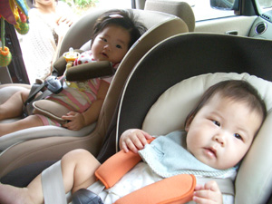 昨日は、友達とベビマに行ってきました♪2人で1台の車。もちろん、ちゃんとつけましたよ~。チャイルドシート。双子ちゃんだと、いつもこんな感じになるのかしら。。。もちろん隣に座れないし、お世話ができないから、グズるかなぁ。と思ってましたが、意外に大丈夫でした♪帰り、ミュウはグズグズ言ってたけど・・・久しぶりのベビマです♪楽しみにしていたんだけど。。。ミュウ、動く方が楽しいらしく。。。全く仰向けでマッサージはさせてくれませんでした。。。変な形で、マッサージをした気分になってます。。。しかも、半分くらいしたら、機嫌が悪くなり。。。おっぱいをあげたら、そのまま寝ちゃいました。。。服を着せても起きないくらいには熟睡!!!なのに、その後のランチを食べようとしたら、パッチリ目を覚まし。。。今寝てて~!!今回、ベビマに来ていたのはゆうな達を入れて5組。8ヶ月の男の子が2人。3ヶ月の女の子が1人。で、友達のベビの6ヶ月とミュウ5ヶ月。3ヶ月のベビのママさんに、「しっかり首が据わってますね~♪」って言われたんだけど、まぁ、もう5ヶ月ですから~。でもでも、そのベビちゃん、すでに体重は6kgあるそうで。。。先週、ミュウは計ってみたら、服を着て6.5kgだったから、そんなに大きさが変わらない><最近、ほんっと体重、増えなくなったなぁ。。。まぁ、こんだけ動いていたら仕方がないんだろうけど。。。あんまりマッサージは出来なかったけど、他のママさんたちとおしゃべりできたのは楽しかった♪やっぱり色んな場所に参加したいな~♪♪♪