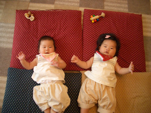 ミュウは、起きている時、ず~っと動いている。ガサガサガサガサ・・・それはもう、5ヶ月児とは思えないくらい。。。1週間前につかまり立ちをしてから、立っている時間も長くなり・・・今では片手を離しても大丈夫♪ミュウ・・・あなた、生年月日、ごまかしてるだろ・・・そんなミュウ。寝ている時はというと・・・もんのすご~く寝相が悪い・・・とおちゃんの布団、ミュウの布団、ゆうなの布団と並べて寝てるんだけど・・・ミュウが自分の布団にいることは、ほぼない・・・とおちゃんの布団のど真ん中で寝ていたり・・・(とおちゃんは、空いてる場所を探して小さくなって寝る)ゆうなのマクラの上に器用に乗っていたり・・・(どうやって上ったの??)ゆうなにピッタリ引っ付いて寝ていたり・・・(かなり暑い・・・)上に上に上がっていって、押入れに頭をぶつけて泣いていたり・・・(ほぼ毎日)布団のない畳の上で寝ていたり・・・(落ちたら気付いて・・・)とにかく、ミュウは寝ている時に、色んなところにいく。寝る前に、ミュウを踏まないようにするのは・・・けっこう難しい・・・
