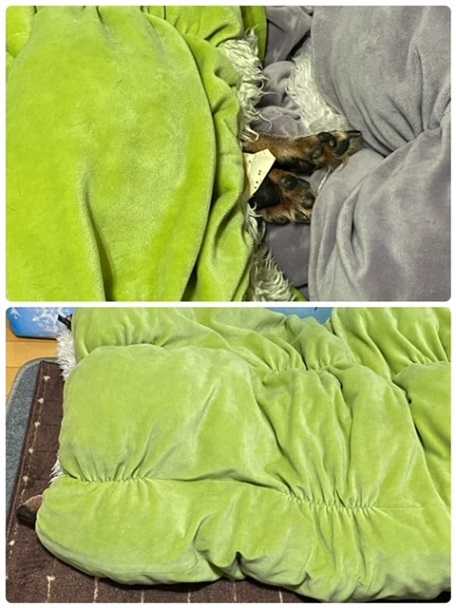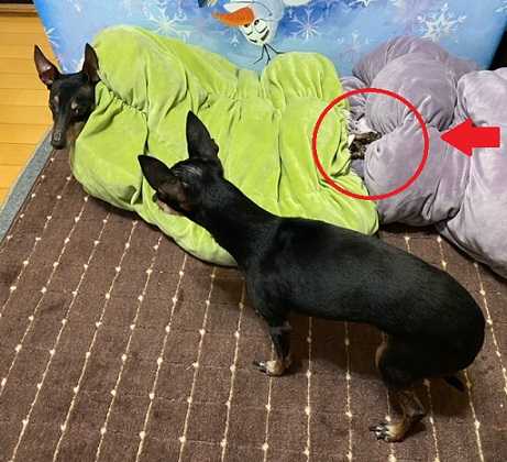 黄緑の方に前足先と鼻先が見えていました。