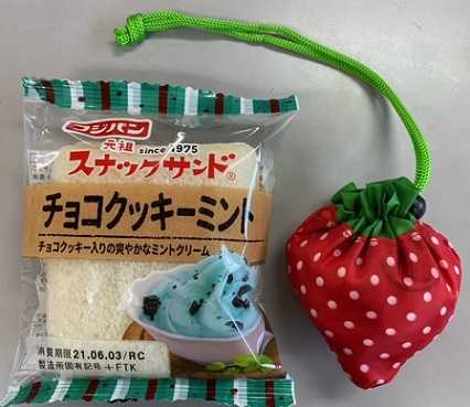 ひもを引っ張るとエコバッグが収納されてイチゴになるんですよ
