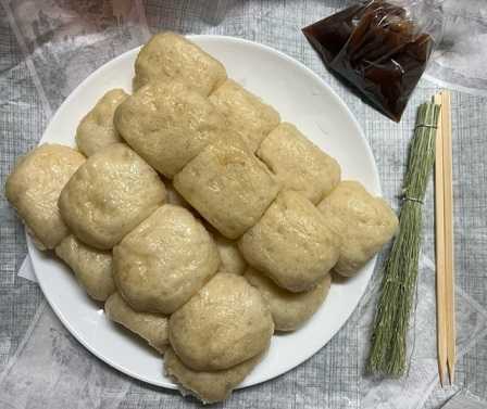 蒸して作ったまんじゅうを竹串に刺してありますが