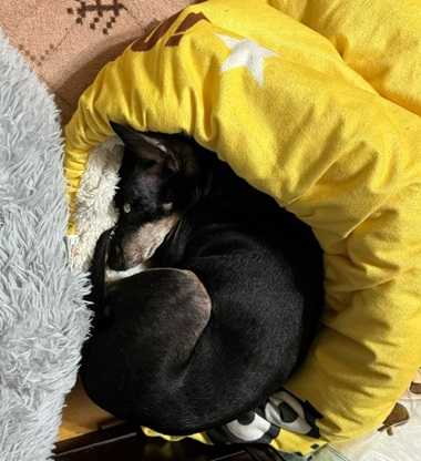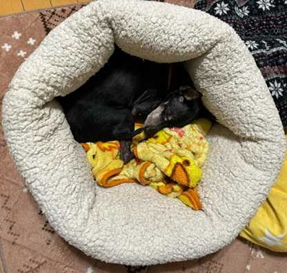 壺ベッドにスッポリと収まるルーク。