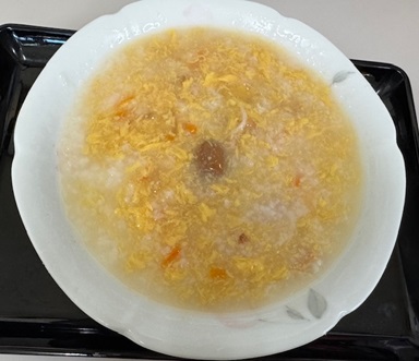 レトルトの「梅がゆ」に豚玉丼のレトルトを掛けレンチンしました