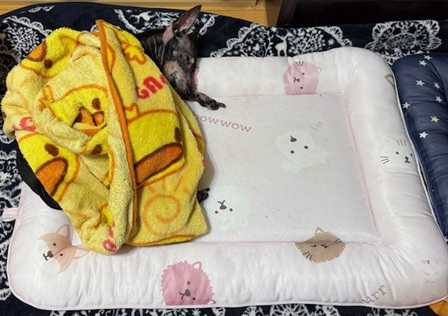 すみっこのほうで、毛布掛けて眠っているレイア。
