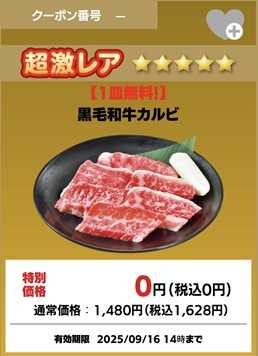 超激レア「黒毛和牛カルビ」無料クーポン当たりました