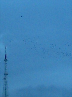 29日夕方4時30分頃の宮沢橋からみた八木山の鉄塔付近の写真。見えずらいかもしれませんが鉄塔の右側の黒いポツポツは全てカラスで大群でねぐらに帰るところでしょうか、その数に圧倒されます。まるでヒッチコックの鳥みたいな光景を見たい方は夕方の宮沢橋に集合しましょう。