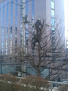 先日、オフィス前の新寺通りの街路樹の剪定が行われました。新寺通りの街路樹はプラタナス(たぶん)ですがその細い木に直接登っての剪定作業。わたしは高いところは全然大丈夫ですがあんな細く不安定なところでは×。職人芸ってスゴイですね、ご苦労様です!