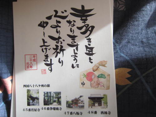 新年が開けましたので、みなさまに 挨拶の代りに、今年の年賀を!定番の四国八十八の旅48番まで、やってまいりました!年末から、深夜映画を録画していて、そればかり見ていました寅さんの映画で笑い、スターウォーズを2本と・・・・・寅さんの映画を見ていると、古き良き昭和の人情映画だなぁとさて、餅も買ってあったので、年明けから、雑煮作り我が家は白みその雑煮!味は聞かないでください(笑さぁ、これから実家に帰る準備して、帰る予定です高速道混んでいるかなぁ???2日は同窓会があるからなぁ・・・・今年も宜しくお願いします!