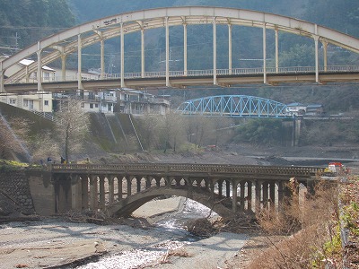 今日は曇天で、昼から晴れてくる? 昨日から、過去の楽天 画像管理をいろいろと 見ていました 楽天の都合で、画像は半分ぐらいになったような? で、見つけたのが、ダム湖の下に埋もれていた橋! 以前、渇水時にダム湖から役場が出てきたとかありましたが、 これはダム湖の水をすべて抜いて出てきたその時期限定の写真 手前の橋の下に橋がある 昔、ダム湖の下にはこういう風景があったのだと数人の人が見に来てましたからね 多分、昔、此処に住んで居た人が懐かしく見にきたのだろうと 今はまた、ダム湖の下で見ることは出来ません さて、次は地元のほうにあったという幻の橋! 今は橋桁は残ってるのかなぁ? 誰がつけたか、こんにゃく橋です! 飲んだ時に、先輩からこんな橋があったのだと聞いていました これは高知でいう沈下橋、徳島では潜水橋ですがね 多分、この画像はネットから頂いたものだったはず(笑 たまたま、職場に同県の後輩がいて、知ってるかと聞くと なんと、なんと、通学でこの橋の上を自転車で渡っていたと! これを見ると本当に渡って居たのだと!向こうには眉山が映っていますねぇ