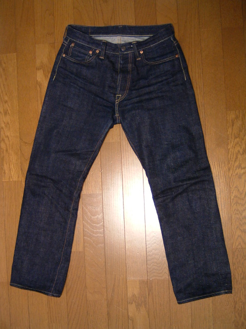 久しぶりに未使用ジーンズの紹介です。16本目に購入したのがこちら↓「BIG JHON R005B」2007年12月に購入。オークションでリジットのものが¥10,000-でした。購入後、テンション上がってすぐにワンウォッシュ→乾燥機をやっちゃいました(^ ^;)足を通してみた感想は、重い…15ozということですが、もっとありそうな雰囲気です。硬派なオーラを感じるジーンズです。 ↓↓↓シルエットはやや細めでスッキリとしています。トップボタンのみパッチのデザインが施されています。トップ以外は手抜き感が…全てブラックです。直線2本のシンプルなステッチです。ビッグジョンのステッチはコレです。タブはブラック。ゴールドの刺繍がイケてます。乾燥機にかけても変化無しでした。ブラックのパッチ。ベルトが通るデザインです。R002と違って変化が分かり難そう。これは残念(>
