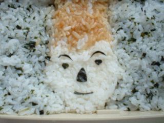 5時半に起きた時には雨が降っていました。それほど強い降りではなかったのですがだんだん強くなって台風が来るようです。しかし、天気予報で言っていたように午後に向かって小雨になっています。本日は花輪くんです。本当は昨日作る予定でしたが、バックのご飯をケチャップで赤くしてから花輪君が茶髪だと気がついて延期にしました。今日は忘れずに茶髪が作れるようにしました。おかずは手前から・揚げのチーズ焼き・ポークビッツとコーンの炒め物・きんぴらゴボウ・マッシュポテトの茶巾・りんご・枝豆揚げのチーズ焼きは油抜きした揚げを小さく切ってアルミケースに入れてケチャップとシュレッドチーズを載せてオーブントースターで焼いただけです。ラリーが今朝からくしゃみを連発して鼻水をかんでいます。雨が多くて湿度が高く、むっと暑かったり、涼しかったりとまた体調を崩しやすい気候です。ラリーは風邪をひいたり熱が出ると大騒ぎするので気をつけて欲しいです。