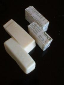 10年ぶりに作った廃油石けんはめでたく解禁を迎えました。やはり柔らかくて、泡立ちは多くありません。ルークのYシャツの襟や靴下の下洗いをしたら落ちはなかなか良かった。しかし、石けんを作ったと友達にいくつかあげてしまったの大きめのブロックが2個しか手元に残っていません。土がついたルークの靴下や体育着を洗うとすぐに無くなってしまいそうです。少しだけ残った廃油とショートニングに使いさしの油を入れて石けんを仕込もうかなと考えていたら、「たけ」さんが廃油を持って来てくれたのでさっそく作りました。・ショートニング 100g・廃油 300g・ラード 100g・EO ローズマリー、メリッサ 各小1/2・ディスカウント 5%茶葉をインフューズしておけば良かったのですが、緑茶を濃い目に出したものを使ったら茶色くなってしまいました。(私はいらちです。)固まってきたところはかなり白くなっているので使用には差しさわりがなさそうです。前回の石けんのときに書かなかったのですが、ショートニングは期限切れしていたものです。ショートニングも片付いて、石けんも出来たしめでたい廃油石けんはリサイクルなので昨夜『R』の消しゴムハンコを作りました。片面に『R』を、もう一方には『Levi』のハンコを押しました。そうそう、今回苛性ソーダをバーミックスのウイスクを使って回しながら入れました。バーミックスは長時間回せないのでグルグルは手です。でも、トレースが出るのがすごく早くてビツクリです。廃油だけのときは1週間でようやく型出し、次が12時間でトレース。今回は4時間でトレースが出ました。型出しは2日後でその2日後にカット、翌日ハンコ押し。気温の違いもありますが混ぜるのが早いとトレースまでの時間も早くなるって本当ですね。(ハンドミキサーは生地が飛び散るので使わないでと本に描いてありました。)前回仕込んだラード入りの石けんは1週間でかなり硬くなって来ました。使い心地は分かりませんが泡立ちもなかなかのものと聞いています。お洗濯やお掃除用にはラード入りで充分かなと思っています。なんせ入手しやすいのとお安いのが魅力ですよ。今回の材料代は130円ほどですからね。(廃油とショートニングはゴミになると考えれば原価0円ですものね)