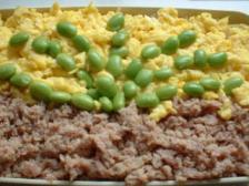 東京の今日の気温は30度の予想です。まだ湿度が高くないので過ごしやすいので助かります。梅雨に入る前にとお風呂のカビ取り第一弾を決行しました。鶏そぼろ弁当です。枝豆で遊んでみました。前に3色弁当で双葉ちゃんを作ったので違う物・・・例えばカエルなどを作りたかったのですが枝豆が言うこと聞いてくれなくて噴水のイメージと思ったら、なんだかねぇ。雑草のようになってしまいました。おかずは右から・ワカメの炒め物・きんぴらゴボウ・サツマイモの茶巾・びわおかずがチョー手抜きになってしまいました。鶏そぼろご飯だから良いか、なんて思ってしまいました。ワカメの炒め物はえのきと干し小えび、針しょうがを入れてごま油で炒めただけです。塩蔵ワカメなので塩味があり、ごま油の香りで調味料いらずです。きんぴらゴボウは昨夜作って小分けにして冷凍しました。これは仕事をしていた時から作っていたもので、ひじきも冷凍可です。市販品でお弁当用の冷食にもありますね。買わなくても作れます。夏用のおかずで冷凍したものを使うとラップしか写らなくて変なお弁当になっちゃいます。今日はイワシのハンバーグを作る予定でしたが、夕飯にお魚を予定しているので鶏そぼろに急きょ変更しました。そうしたらおかずに困ってごまかしちゃいました。(* *;Oh la la~TVを見ていると「○○が食べたい!」「でも作るの大変」と会話して有名料理人が出てくる冷凍食品のCMがありますよね。叫ばれる料理名を聞いて「え、○○が作るの大変? じゃあ何が作れるの」と思いました。お料理するのは大変ですがちょっと手を抜きすぎではないのですか。こういったCMを流されるとお料理未体験の人が「○○って作るの難しいんだ」って思いますよね。そうなるとますますお料理離れが進みそうですよ。先日、同級生のお母さんたちとお茶会した時に「クリームシチューはルーで作るもの、グラタンもMIXを買って作るものだと思っていた」と言われました。私がホワイトソースを自分で作るって言ったら驚かれました。作ってみると意外と簡単なのですよね。