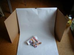 昨日の日記の写真って私が撮ったんですが、今までのとはちょっと違うと思いませんでした?並べ方には納得できなかったもののきれいめに撮れていると自分では思ったんですよね。これには秘密があってデジカメ撮影用のミニスタジオを作って撮ったんです。ミニスタジオは花のポストカードやさんが日記で紹介されていたものなんです。「デジカメ講座」を書かれていて、すっごく参考になっているんです。(え、その割には写真が良くない・・・修行不足です・・・)で、私が作ったのがこちらです。中央にあるのが昨日掲載したSOYJOYです。材料はダンボールと模造紙、ガムテなど簡単に手に入るものばかりです。作業時間は10分程度。使い終わると畳んでフラットになるから押入れの隙間にでも収納できるのも便利です。詳しい作り方は「花のポストカードやさん」のページで見てね。ミニスタジオを作ると撮るのにも気合が入って両面テープなども使って中央の1本が立体的に見えるようになどと工夫をしちゃいました。なのに見せ方がヘタなんですよね~作っていて気がついたのは、壁になる面を貼り付ける時に左右と中央の高さをあわせると、立てたときに若干ですが壁がが前のめりになってしまします。まあ5mmくらいなので気にならない方はそのまま貼り付ければ良いと思いますが、私は嫌なので揃うように作りました。ダンボール同士を貼り付けるときは定規を使うときれいに貼れて便利でした。私が撮るのはお弁当やお料理など小さいものが多いし、撮ってすぐに食べるので作ったスタジオはちょっと大きすぎたようです。こちらは石けんや手作り品を撮影する時に使って、テーブルやキッチンで写真が撮れるように白のミニ衝立を残った模造紙で作ってみようと思います。
