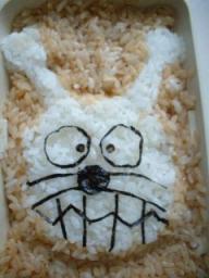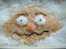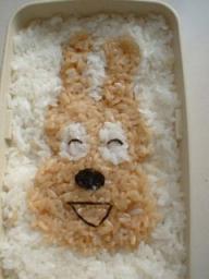 先ほど玄関の掃除をしようと外に出たら、金木犀の香りがしました。お向かいのお宅にある金木犀の木に花が咲き始めていました。本格的に秋なんですね~、でも、今日も暑そうです。名犬?チーズくんです。作り始めてウサギみたいになったかもと思ったら、ちゃんとチーズくんになっていました。アンパンマンには動物系のキャラもたくさんいますね。おかずは手前から・海老のケチャップ炒め・サツマイモのサッパリ煮・うずらの卵入り、さつまあげ・蓮根のきんぴら・タコウインナー・パイナップルちょっと疑問です。さつまあげの生地にゴボウを入れて長細く揚げるとゴボ天ですよね。じゃあ、うずらの卵やウインナーを入れたものはさつまあげなんでしょうか?平べったいものがさつまあげですよね。丸くても長細くてもさつま揚げなのかな?ちなみに関西では天ぷらって言います。(ゴボ天の天が天ぷらですよね。)足を痛めて病院へ行ったラリーですが、昨日の午後に電話がかかってきて・・ラ:「筋肉が切れているって言われた。 全治まで2週間はかかるんだって。」レ:「え、筋肉が切れてたの」へ~、筋肉が切れるんだ。運動して負荷がかかると筋肉の繊維が切れるとは知っていましたが歩けないほど切れるとは初めて聞きました。これでも切れたのは少しだけで、大きく切れると手術が必要になるそうです。レ:「筋肉が硬くなったところに大きな負荷がかかったから切れたんだろうね。」ラ:「でも、よく歩いているんだけどなぁ」レ:「歩いていてもその部分の筋肉は使われていなかったんだよ。」ラ:「そっか。」ラリーはお腹に大きな脂肪の塊を抱いているので腰痛が起こったりします。腰痛持ちの人ってアキレス腱の上あたりが硬くなっているんですよね。(鍼灸の腰痛のツボもそのあたりにありますね。)そういう私も硬いのでストレッチなどで伸ばすようにしているんです。ラリーの場合はまず痩せることが重要です。でも、体操やウォーキング、ジョギングなど地味な運動が嫌いなので健康の為でもしません。それにお酒もよく飲むし・・・悪くなったらそこだけを直せば良いと思っているようです。最近は男性もメタボリックシンドローム対策で運動をしたりダイエットに感心のある人が増えていますね。高齢化社会を迎えて医療費の削減対策としても病気の予防に力を入れています。病気をしながら暮らすより元気で長生きできる方が良いですよね。ラリーはそう考えないらしい。まあ、口が酸っぱくなるまで言っても改善しようとしないからどうしようもないんですよね。しかたないですね。でも、この性格ルークも一緒なんです。ホント良くないところばかり似て可愛そうです。