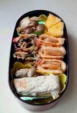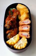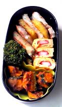 はい、今日も暑いです。東京は34度の予報~もう勘弁して頂戴って言いたくなりますよね。でも、うちの地域は風が吹いて外の方が涼しいくらい。自転車に乗っていると日差しは強いのですが、風に吹かれれば爽やか~全国的にこういう気候だと良いのに。 おかずは手前から・ポークステーキ・小町麩巻きだし巻き卵・巻き巻きちぢみ・シメジとエリンギのソテー・パイナップルです。今日のちぢみは薄く焼いてソースを塗って巻き巻きしました。ニラがたっぷりのちぢみも美味しいですが、あれだとソースを添付しなければなりません。ソースをつけて巻けばそのまま食べても美味しい♪ なんて、ソースの話をしてからこれを紹介するのはなんですが。こちらにはトンカツソースとケチャップをブレンドしたソースが入っています。ソースの専用容器が無くてもラップで巾着にすればお弁当に入れられます。但し、お弁当箱の中に入れないと運んでいる間に敗れるなんてアクシデントもあるかも。使うときは爪楊枝などで穴を開けて出します。この技はamebloのお友達に教わったもので、そのまたお友達がブログにかかれていました。こういう小技って考え付きそうでつかないですよね。無いとか出来ないじゃなくて「何とかならないかな?」って考えるほうが良さそうです。