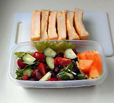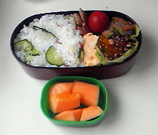 おはようございます。今日で6月も終わりですね。明日からは7月だから本格的な夏ももうすぐ今年も暑い夏になるらしいけど、どうなのかしら。熱中症に注意ですね。サンドイッチの具がワンパターンでちょっと飽きてきたので今日はフレンチトーストを作りました。焼くだけでは芸が無いので(笑)溶けるチーズをサンドした物と焼いてからグラニュー糖とシナモンを振った物を作りました。サラダはレタス、水菜、ミニトマト、金時豆、きゅうり、です。デザートのレッドメロンもつけました。なかなか良いお弁当になったと思うのは私だけ?お中元の受付が始まってサポートで一時間ほど入っています。7月に入るとどっとお客さんが増えるから対応が間に合うか心配です。