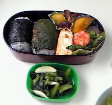 おはようございます。雨の東京です。台風の影響だそうですね。集中豪雨みたいになるのかしら。心配です。梅入海苔巻おにぎり、大葉の味噌漬け巻きおにぎり、出し巻き卵、エビとアスパラの塩麹炒め、サツマイモとコンニャクの煮物、きゅうりの甘酢炒め、蕪の葉の塩麹漬け、です。ベランダの大葉が育って来たので大きくなったものを収穫して味噌漬けにしています。たっぷりの味噌で漬けると味が濃くなりすぎるので大葉に薄く塗るだけです。これ、すっごく美味しいです。醤油漬けもありますが、私はこちらの方が好きです。こうしておけば季節が終わってからも長く楽しめます。キュウリを加熱して食べることって少ないですよね。でも、甘酢炒めは美味しいんですよ。ごま油を引いてショウガと戻して細切りにした干ししいたけを入ます。香が出たら乱切りにしたキュウリを加えて炒めます。甜菜等、お酢、醤油で味付けて出来上がり。