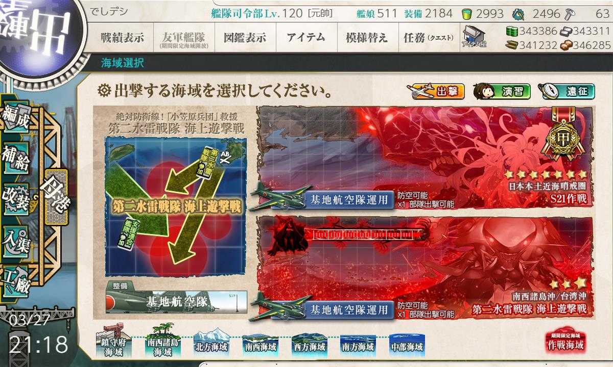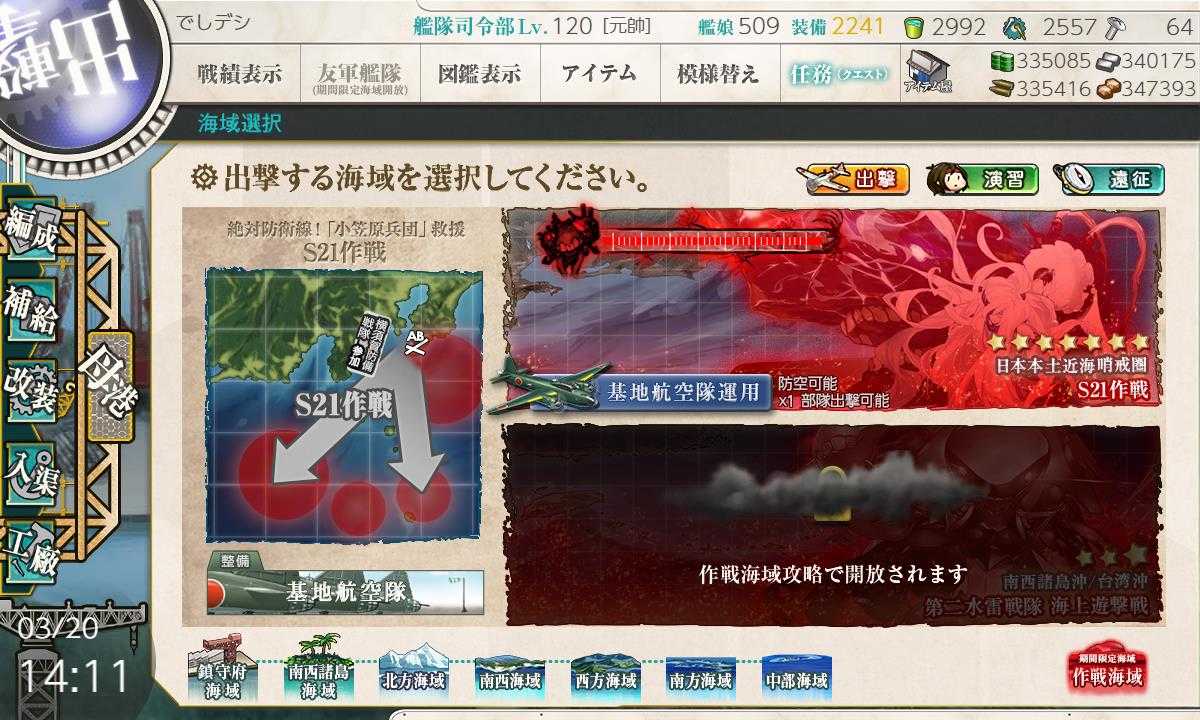 先週の艦これは早春イベントの後段が実装されました。が、前段に引き続き最初に2海域で最後の海域はまだ実装されず… だったのですが、今日の夜明け前に実装されたようです。なので未だに情報ははっきりしていません。ただ流石にE1は始めないと終わりそうもないです。幸い前段で使用した札は結構後段でも使用できるようなので最後の海域が実装されて、札がどういう割り振りかはっきりすれば難関のE2に取り組めそうです。もうE2は乙でやるつもりなので後は早く情報が出そろってほしいです。E4、E5は流石にE2よりはマシなようです。E6がどうなのかはまだ分かりませんが、普通のレベルでも最終海域はレベルの差はあれ難しいのは当たり前なのでどうなることやら…実装されたのが月曜の未明なので情報が出てくるのは今日の夜以降でしょう。明日からは無理にしろ宿直明になる木曜日からは始めたいです。まだ始めていないイベントの最初の海域(E1)です。