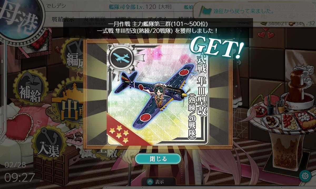 先週の艦これは早春イベントの前段が3/1より開始されました。ところがこのイベント、始まると各所から批難轟々で前段3海域あるんですがその2海域目(E2)が難しすぎると。この後、後段の海域もあり、海域や作戦毎に札と言うのが使用した艦娘に付くためここで主戦力を全部投入と言うわけには行かないんですが、そのくらいでやらないと一番難しい甲クリアは厳しいそうです。こういったこともあり、とにかく情報が出てくるのがいつものイベントに比べて圧倒的に少ないです。サブの艦娘とかあまり所有していない自分ではある程度の情報が出そろうまで始められないんですよね。そんな感じでとにかく今回は酷いです。なんでもかなりの数の引退者が出てるとか本当にこんなことして誰得だと思うんですけどね。難しいだけのクソゲーなんて普通のユーザーは嫌うでしょうし、運営はユーザーが減れば当然困るし、ただでも新規には敷居が高い艦これなのにますます新規が増えないという最悪のパターンだと思うんですが。まあ、だと言って簡単すぎてもつまらないんですが。一番難しい甲クリアと書いている通り難易度は選択できるのですが、クリア時に貰える装備などに差が出るんです。なので難易度を下げるかの目安の一つなんですが、このE2は下げてもいいかなとは思うレベルですね。特にここまで難易度か高いと言われいれば更にですし、次のE3に比べれば尚更です。E3はどうしても甲クリアがほしいですね。幸いE3は標準レベルらしいので。E2の難易度を下げるにしろある程度の情報が出るまでは様子見です。以前書いた1月の戦果ランキングは無事500位以内入りました。これがその時配られた装備です。思いっきりハズレの月でした一式戦 隼III型改(熟練/20戦隊)は今回のイベント報酬の先行配布とアナウンスされており、12.7cm連装砲D型改二は今までも入手機会があり特に価値があるものでもないという最悪に近い報酬でした。前の月も1つ目はこれの下位装備の一式戦 隼II型改(20戦隊)だったんですが、2つ目が甲標的 丙型★+5というレアな装備ではないんですが使用頻度が高く、作るのが大変なのでなかなか良い装備だったんですが、今回はホント最悪でした。が、実は今回貰った一式戦 隼III型改(熟練/20戦隊)が例の異常に難しいE2の甲クリアの報酬だったので装備の為に甲クリアする必要がなくなったのです。それだけは助かりました。