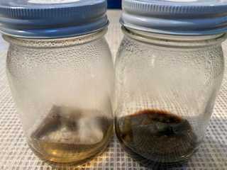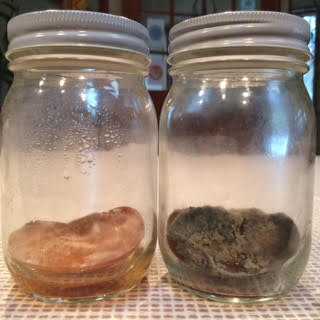果肉もエキスもさらに腐敗が進んで真っ黒になっている一般農法のリンゴ(右)