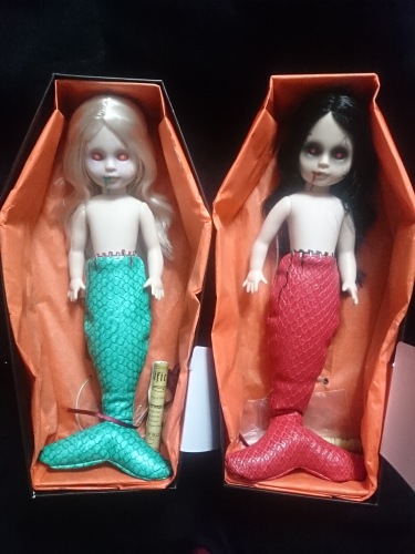 私は人魚が好きです。たまたま見つけてお迎えしちゃいました“リビング デッド ドールズ”、訳すと“生ける屍人形”でしょうか。棺桶ボックスに、死亡証明書も付属しています。この子たちは30cmぐらいですが、ミニサイズの子たちもいます。ミニの子は二人いましたが、通常サイズの子は初めて。ママンに「負の気を感じる」って言われたことがあるので、怒られそう…でも可愛いよちなみにブロンドちゃんが通常で、黒髪ちゃんはバリアントです。