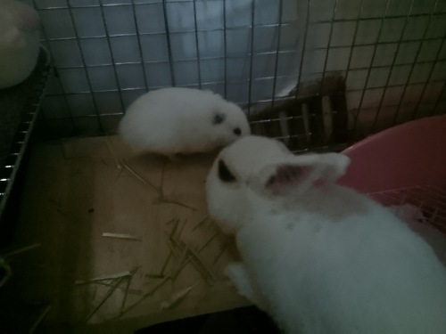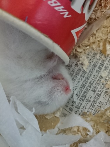 小雪のご飯を頬袋に溜め込む雪之丞。でもチモシーペレットは不味いのか残してました