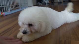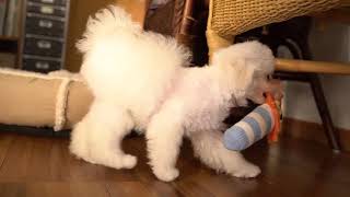 可愛いお顔のホワイトの女の子です。元気一杯です。おもちゃをくわえて振り回しますが、おもちゃの重さに振り回されてふらついています。明るい性格でお家の雰囲気も楽しくなりますよ。犬も人も好きな子です。