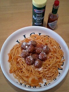 本日カミさんは幼稚園に行きまして昼過ぎに帰宅の予定。 {何か作っておこうか? と言ってくれましたがたまにしかない一人の昼食。 ( ̄へ ̄){好きなものを喰うぜぇ! と言い放ち配達ついでに、たまにはコンビニ弁当でも・・・と思っていた。しかし、事務仕事ができたので外に出れない。店番を頼んだババが 昼まで事務所に居る・・・俺が配達なんかに出ても心配無いようにと昼まで居る・・・ (;--)これじゃコンビニ弁当買って来れないわなぁ・・ ただでさえ、カミさんが留守だと 「食べる物有るか?」 と心配するのです。これは嬉しいんだけど、勝手にやりたい俺としては・・・ (;^^){あるある!用意して行ったから と答える。 カミさんの立場も有るしね(^^;) さて・・・昼飯を食べに、ジジババは家に戻って行った。 (;--)店空けられない 何か無いか?と食品庫と冷蔵庫を捜索。( --) ・・・ ( ̄ー ̄)ほうほう・・・ また始まりました。創作料理(;^^) パスタを茹でてる間にタマネギを刻んで、軽く炒めておいて・・・レトルトのミートボールも用意して・・・茹で上がったパスタを、タマネギと一緒に再び軽く炒め・・・ケチャップを絡めて、塩コショウで味を整えて・・・ドサっと盛り付けた上に、ミートボールの皆さんを乗せれば・・・ ドスン! ミートボール・ナポリタンの完成!! Щ( ̄~ ̄) う~む・・・ カロリー高め!味の評価低め!!